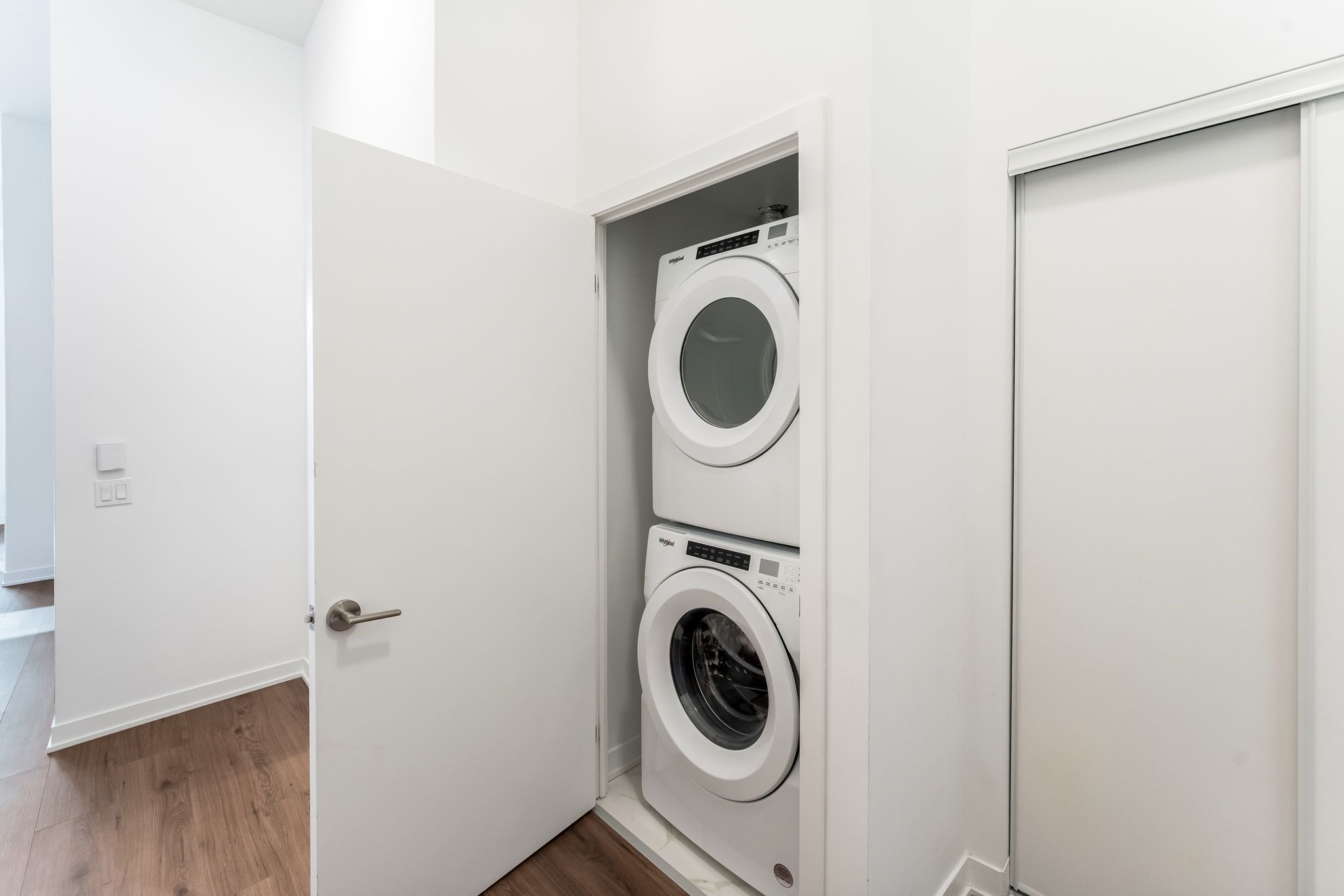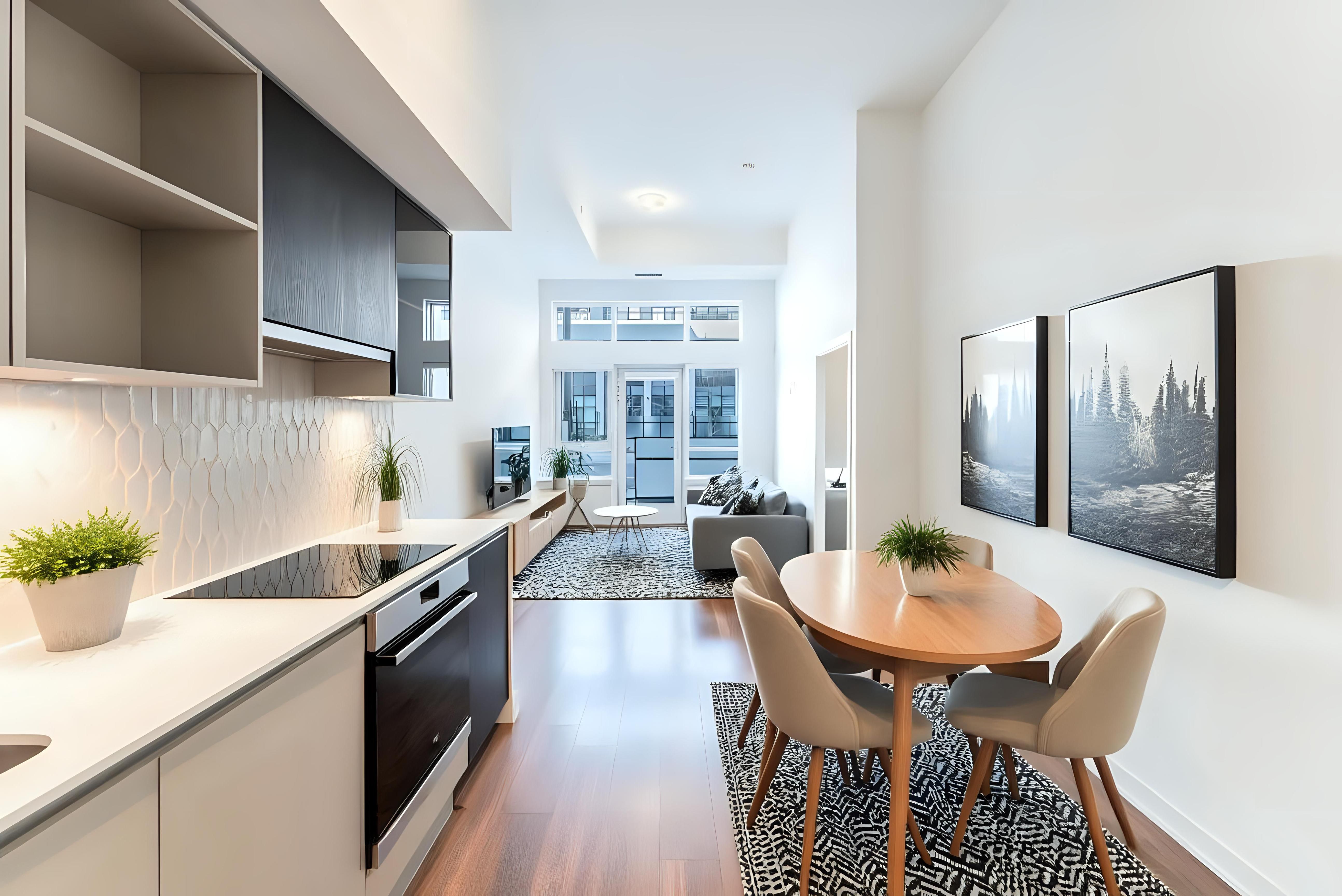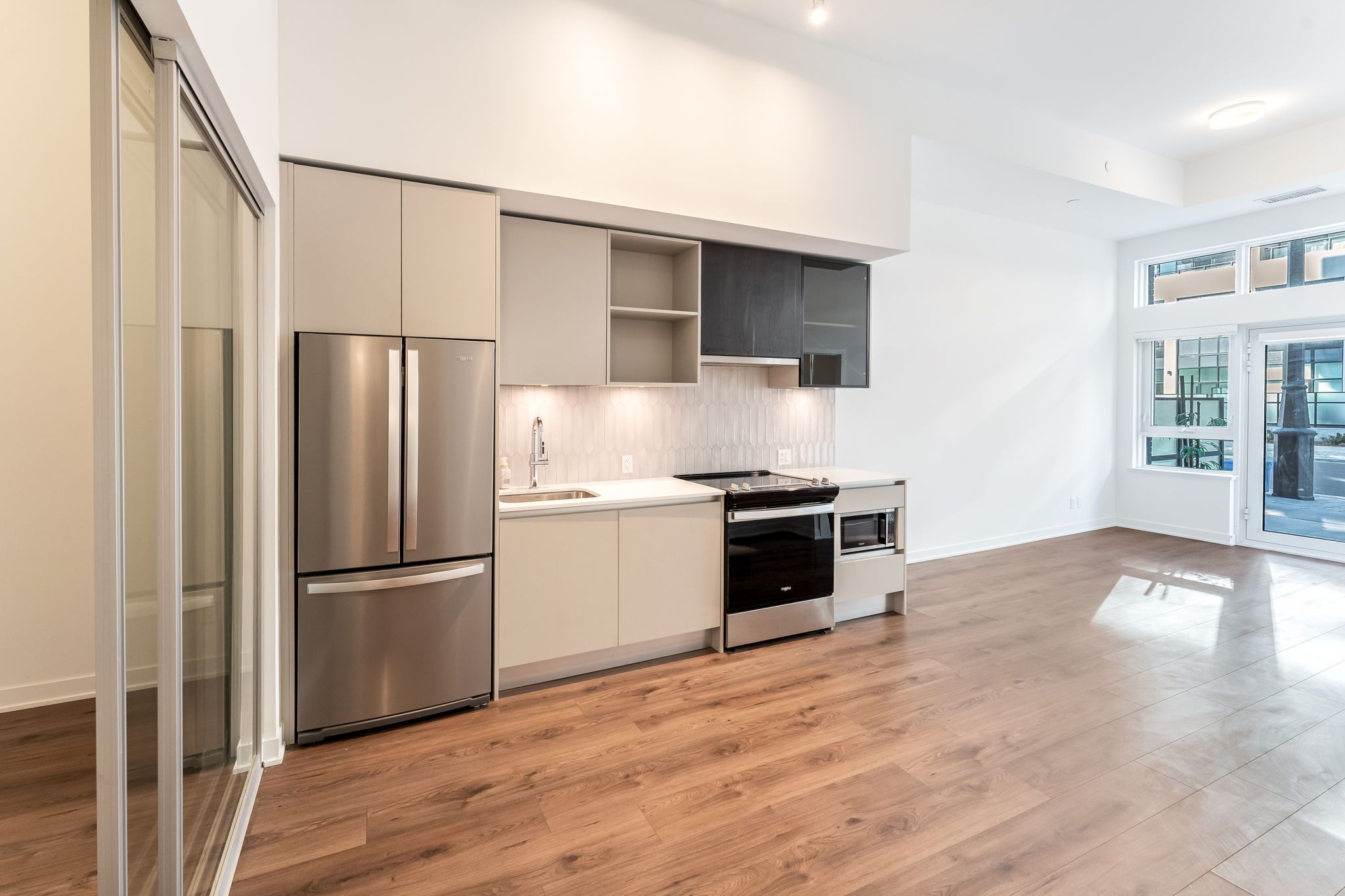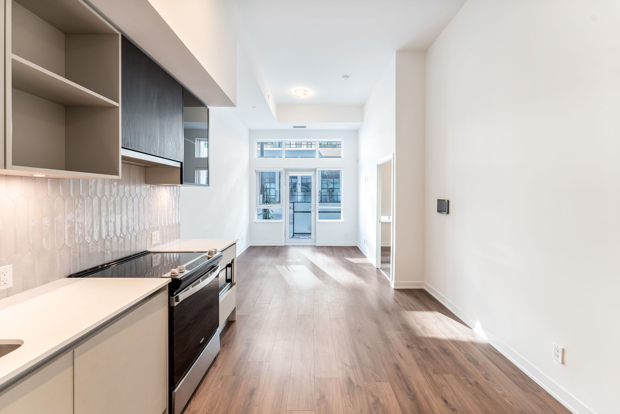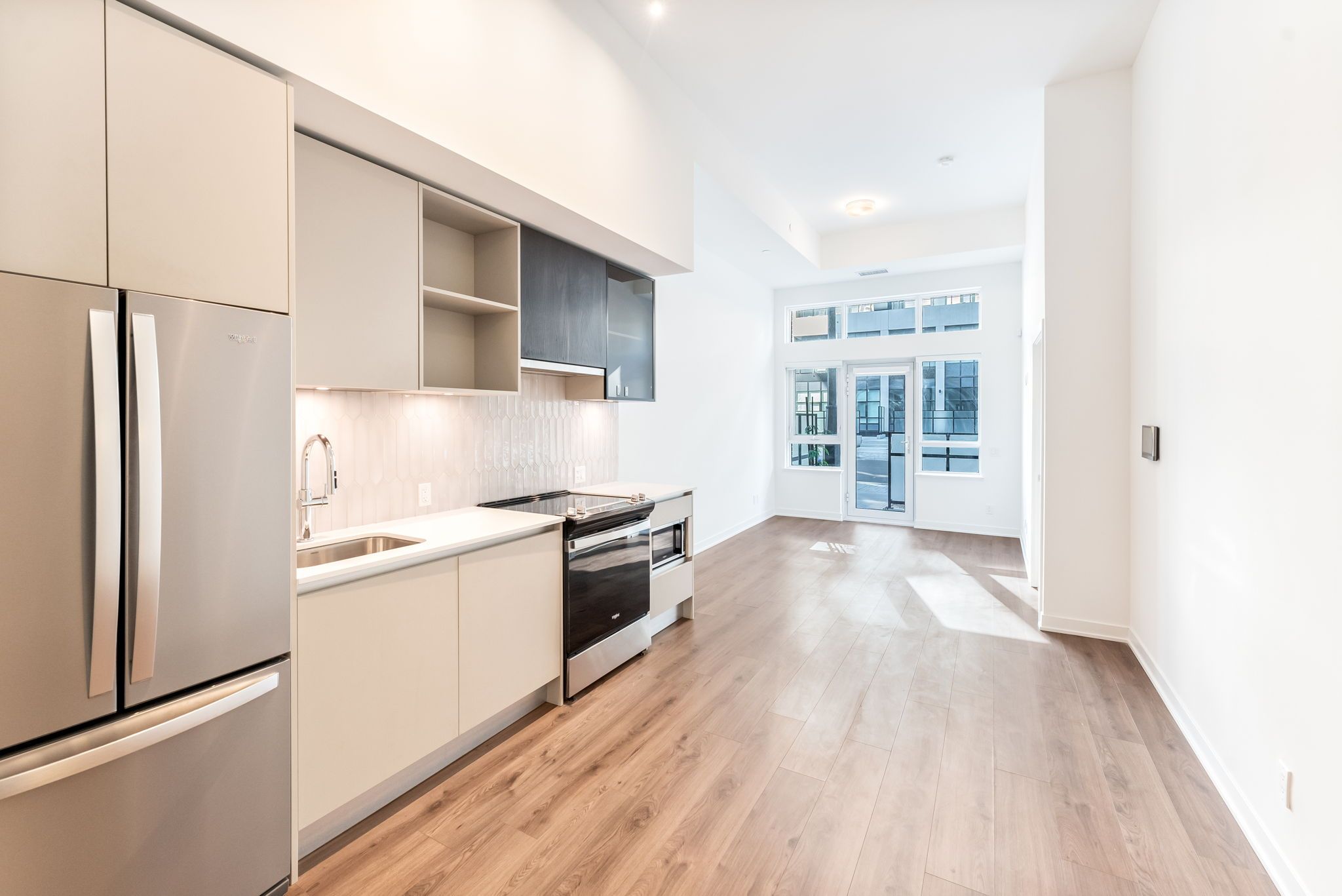 Welcome to #114-405 Dundas Street West, Oakville, a 752 sq. ft. ground-floor condo with 2 bedrooms, 2 bathrooms,and a 266 sq. ft. private terrace with a gas hookup—perfect for entertaining. Inside, enjoy modern convenience with a built-in AI Smart System, digital door locks, and an in-suite touchscreen wall pad. The kitchen features soft-close cabinetry, quartz countertops, a porcelain tile backsplash, stainless-steel appliances, and a full-sized fridge/freezer. With 12 ft. smooth ceilings, floor-to-ceiling windows, and a stacked washer and dryer, this unit offers style and functionality.